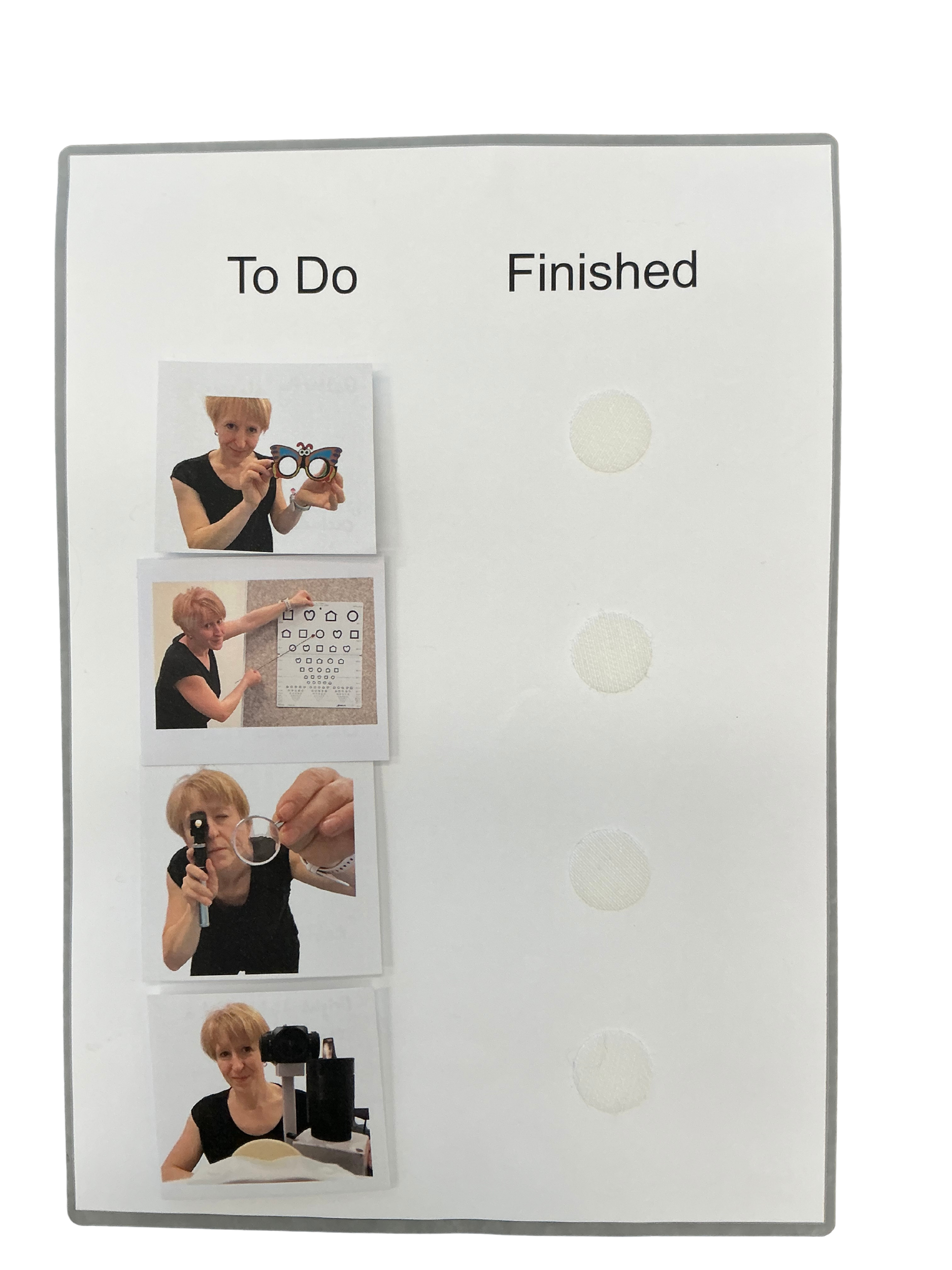 A Special Eyes choice board. The board comprises two headings: ‘to do’ and ‘finished’. Below are a series of ‘patient view’ images of Dr Ursula performing various tests. The images start under the ‘to do’ heading, and are moved across to the ‘finished’ side as they are completed.
